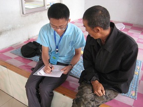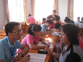 通过队员们的互相配合,工作到了12点半左右就结束了,几个小时的持续战斗让我们都疲惫不堪,队员们甚至连口水也没来得及喝、汗也没时间去擦,声音也沙哑了,但是大家谁都没有怨言,我们很快乐很荣幸能为居民献出一份力。次日,农民健康体检服务团队来到了亚太水泥厂职工医院,计划给职员们做调查和体检。前一天的经历使我们信心满满,可是预约的情况并不像想象的那么好,职工来的并不是很多,但经过志愿者的积极努力,由原来的集中调查变为“穿街入户”宣传,调动更多的农民朋友参加到健康体检中来,活动最终取得圆满成功。这次“双阳之行”很苦很累,但乏味中充满着希望,苦涩中流露着甘甜。