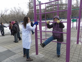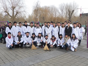 志愿者们身着代表着医学生身份的白大衣,手持扫把、簸箕和抹布等清洁用品在教学楼前集合后,徒步前往朝阳公园。寒冷的天气挡不住同学们“学雷锋”的热情,厚厚的积雪掩不住同学们志愿服务的干劲,大家自动分成几组,清扫健身区域内的积雪和垃圾,用抹布将健身器在上的污渍擦拭干净。经过一个多小时的紧张劳动,同学们成功完成了今天的工作。期间,正在锻炼的市民对同学们学习雷锋的行为赞不绝口,并表示将把这种学习雷锋的精神继续传递。