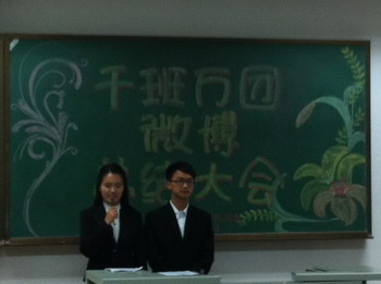 团委主办的“千班万团”微博总结大会于吉林大学新民校区第二教学楼2103室举行。团委负责人苏国范,团委副书记冮璇、于多,团委各部部长、部员以及2011级和2012级各班团支书出席了本次大会。